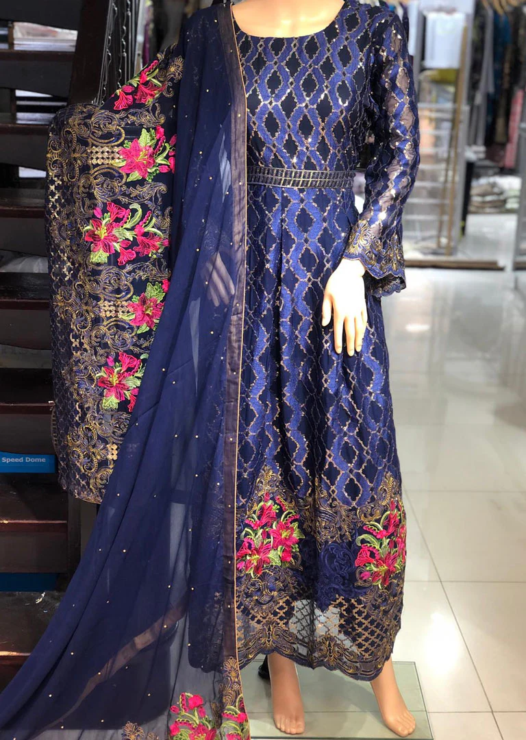 Heavy handwork chiffon suit matched with silk trousers and a embroidered net duppatta.