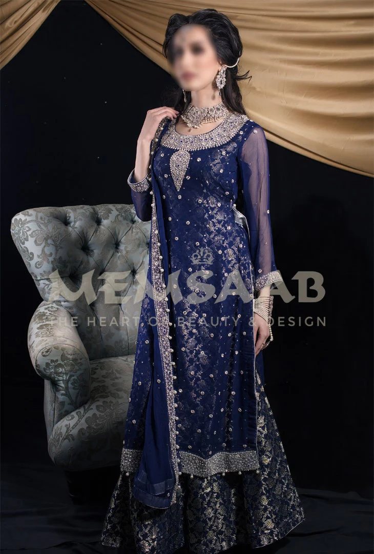 A luxurious navy chiffon suit with diamante work.