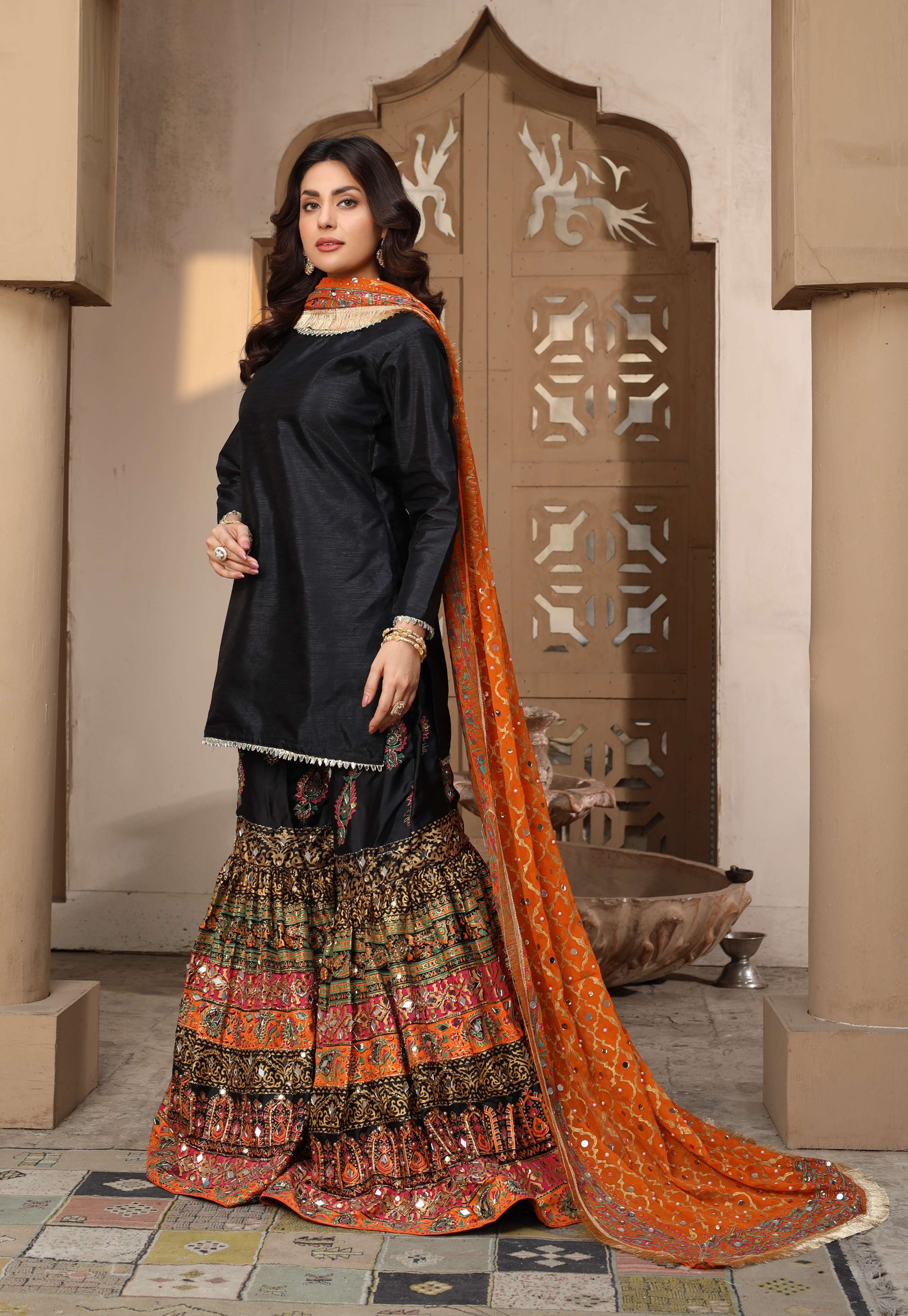 A heavy mirror work shararah with pearl and stone work. Matched with a shirt and duppatta.